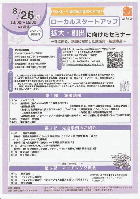 この度、地方自治体職員、ローカルスタートアップ推進に向けた活動をしている方(今後活動したい方)、中間支援者、地域金融機関、商工会議所・商工会、地域で創業を検討している方を対象にセミナーを開催いたします。